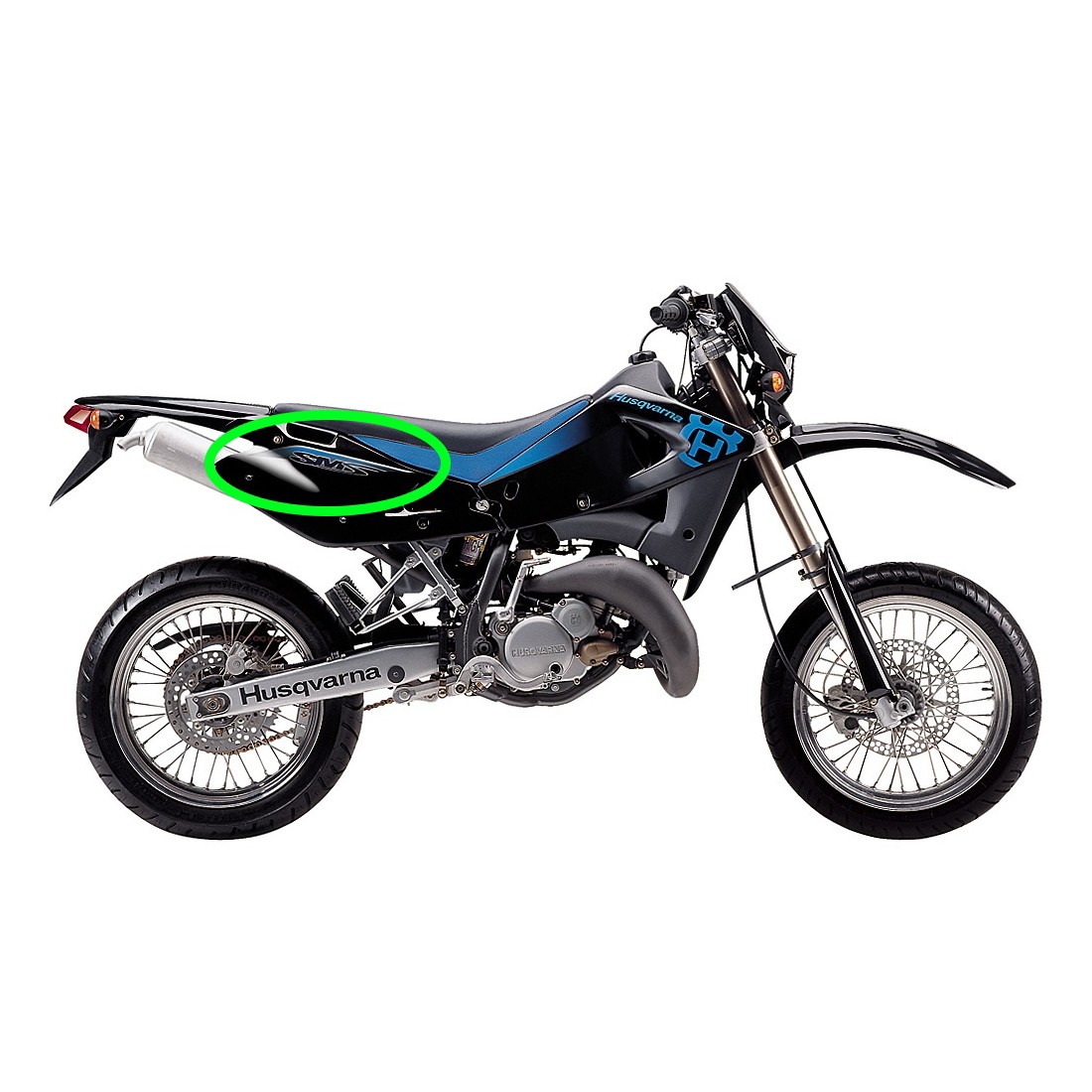(R.18839) Vendo coppia decalchi fianchetti carena posteriori nuovi per Husqvarna SM S 125 cc dal 2000 con codice 80A0A2482 e 80A0A2483 di colore nero blu e rosso , il prezzo si intende per la coppia , per applicazioni vedere foto , foto del veicolo solo a scopo dimostrativo