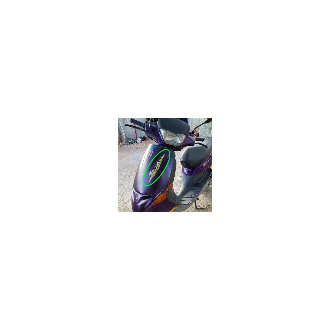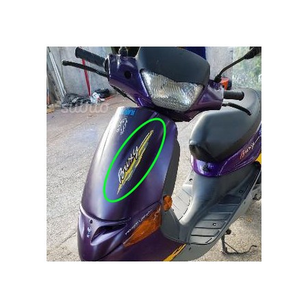 (R.18940) Vendo decalco carena scudo anteriore nuovo per Peugeot Buxy con codice 731394 di colore nero - rosso - arancione - grigio con leggere bolle di magazzinaggio , foto del veicolo solo a scopo dimostrativo