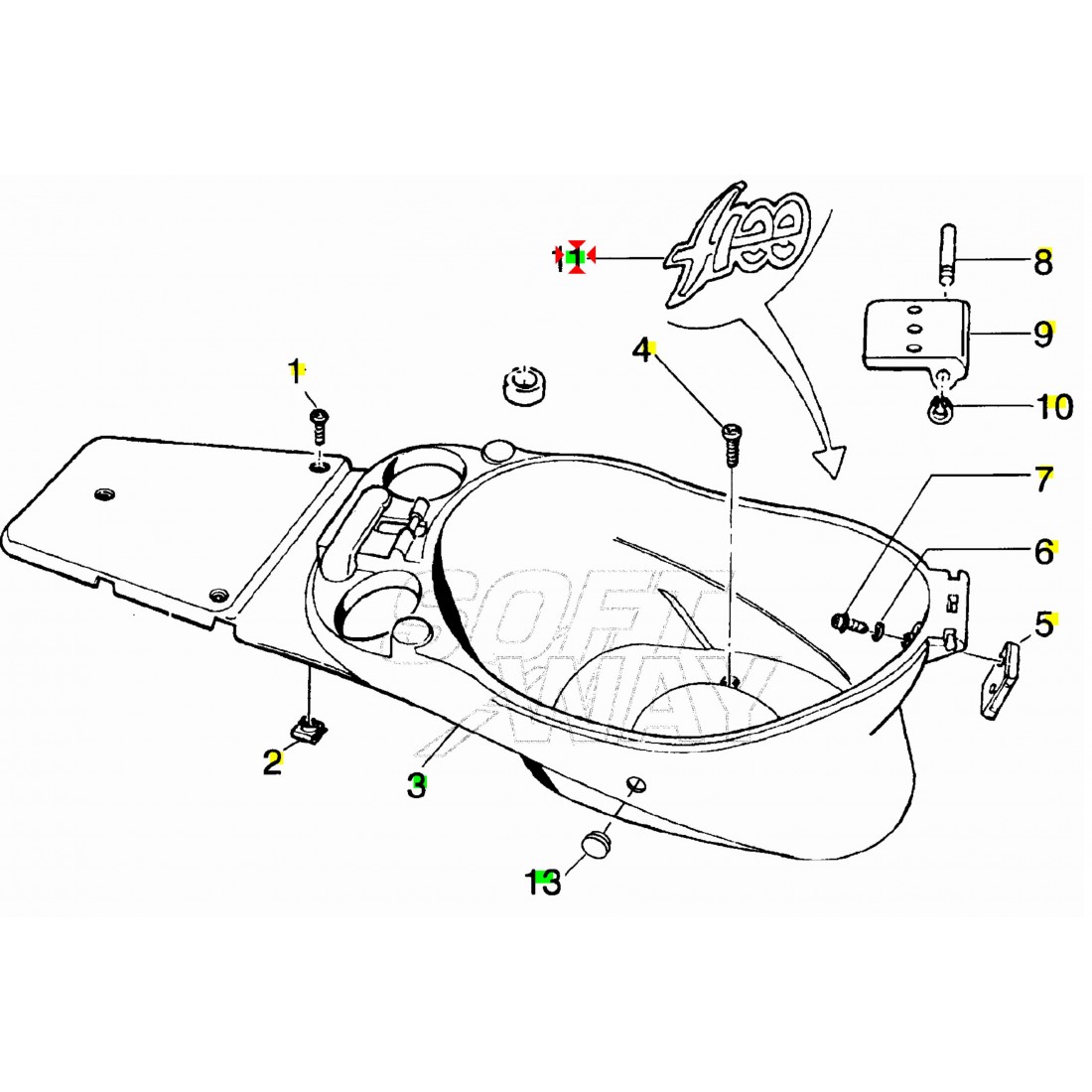 (R.20884) Vendo adesivo resinato scritta " Free "  nuovo sul fianchetto laterale posteriore per Piaggio Free FL 50 cc dal 1995 al 2002 con codice Piaggio 299144 , per applicazioni e spaccato vedere foto