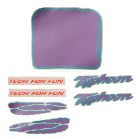 (R.20964) Vendo serie adesivi nuovi di colore viola e verde con scritta "TECH FOR FUN" per Piaggio Typhoon 50 simile a codice Piaggio 296188 , il prezzo si intende per l'interno kit