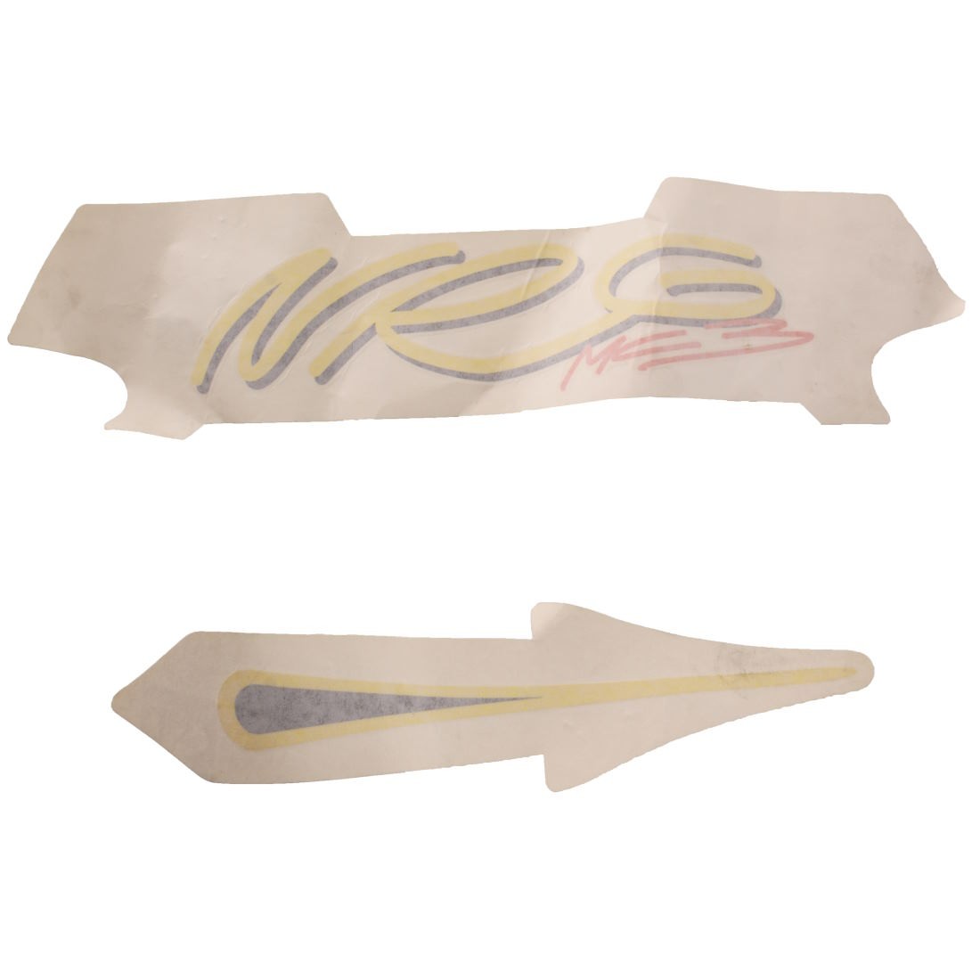 (R.20966) Vendo coppia adesivi nuovi per il fianco posteriore sinistro o destro di colore giallo e rosso con scritta "NRG MC3" per Piaggio NRG MC3 - NRG Purejet con codice Piaggio della serie completa 62081500A5 , il prezzo si intende per la coppia , per applicazioni vedere foto , disponibile solo 1 coppia