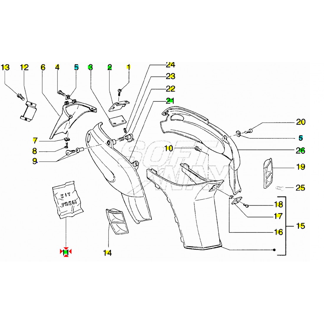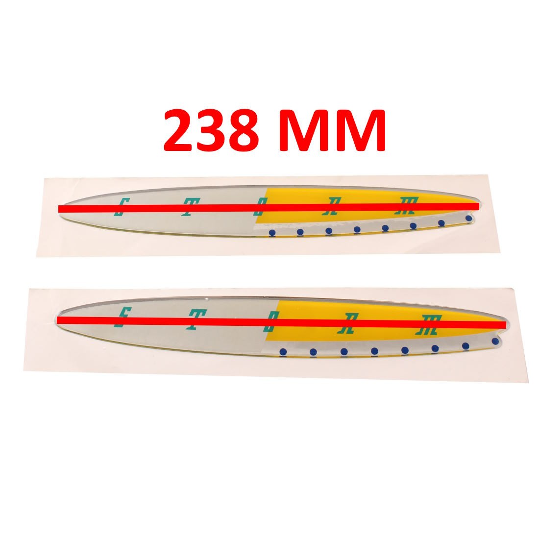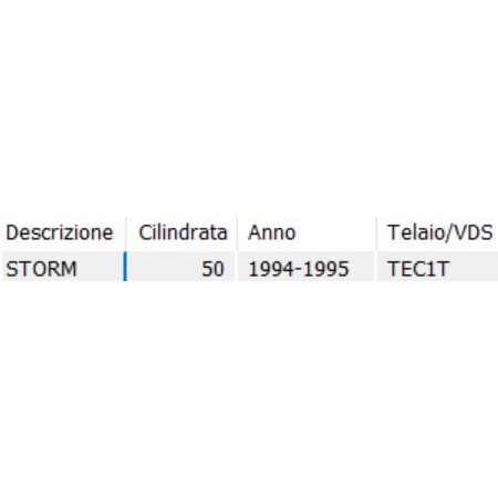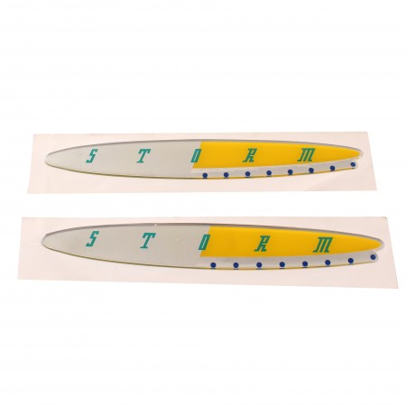 (R.21118) Vendo coppia adesivi resinati nuovi per fianco laterale posteriore destro e sinistro con scritta "STORM" di colore verde con lunghezza 238 mm per Gilera Storm 50 cc con codice Gilera 298377 o 298762 per applicazioni con misure e spaccato vedere foto
