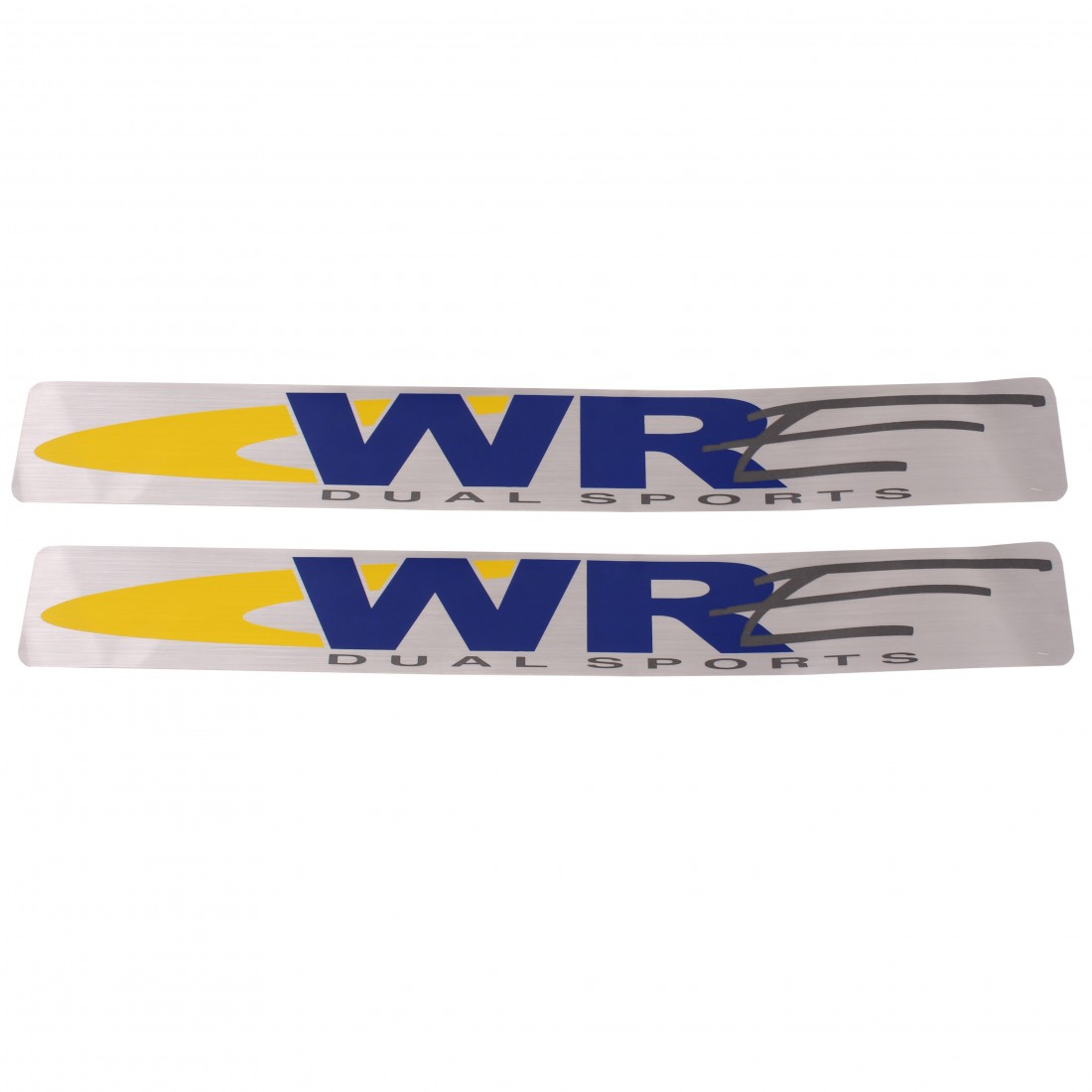 (R.21140) Vendo coppia adesivi nuovi per il forcellone posteriore con scritta "WRE DUAL SPORT" di colore blu , giallo e nero con sfondo argento per Husqvarna WRE 125 cc del 2000 con codice Husqvarna 80A094242 , per applicazioni e spaccato vedere foto , il prezzo si intende per la coppia