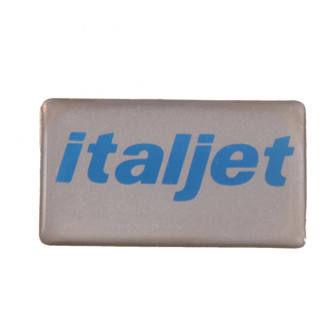 (R.23274) Vendo adesivo in resina nuovo marca Italjet con scritta italjet di colore blu su sfondo grigio con larghezza 52,5 mm e altezza 29,5 mm , per misure vedere foto