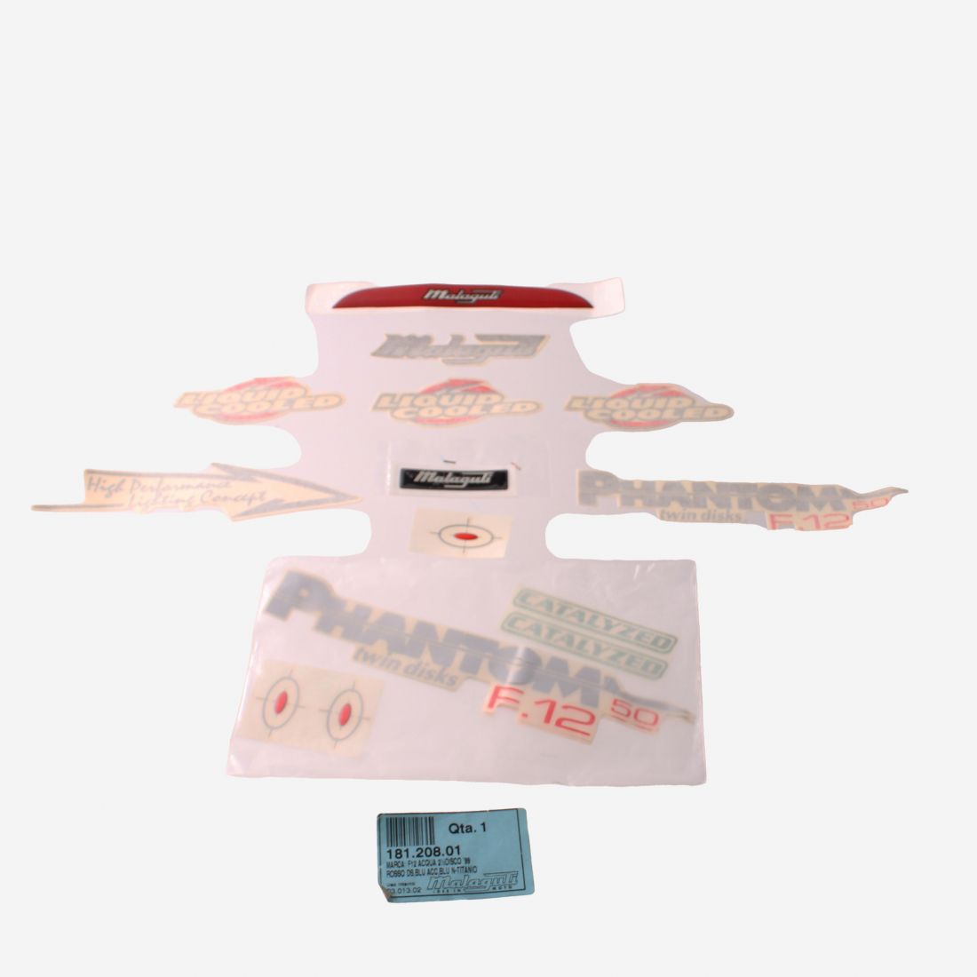 (R.23286) Vendo serie decalco incompleta nuova originale Malaguti con codice della serie completa 18120801 per Malaguti F12 Phantom a liquido dal 1999 , la serie comprende come da foto un adesivo resinato con scritta Malaguti di colore argento con bordo nero su sfondo rosso , un adesivo resinato con scritta e logo Malaguti di colore argento su sfondo nero , un adesivo con scritta Malaguti di colore nero , tre adesivi con scritta Liquid Cooled di colore bianco nero e rosso , un adesivo sui consigli per il carburante , mancano 3 adesivi Phanton Twin Disc F12 , per applicazioni vedere foto