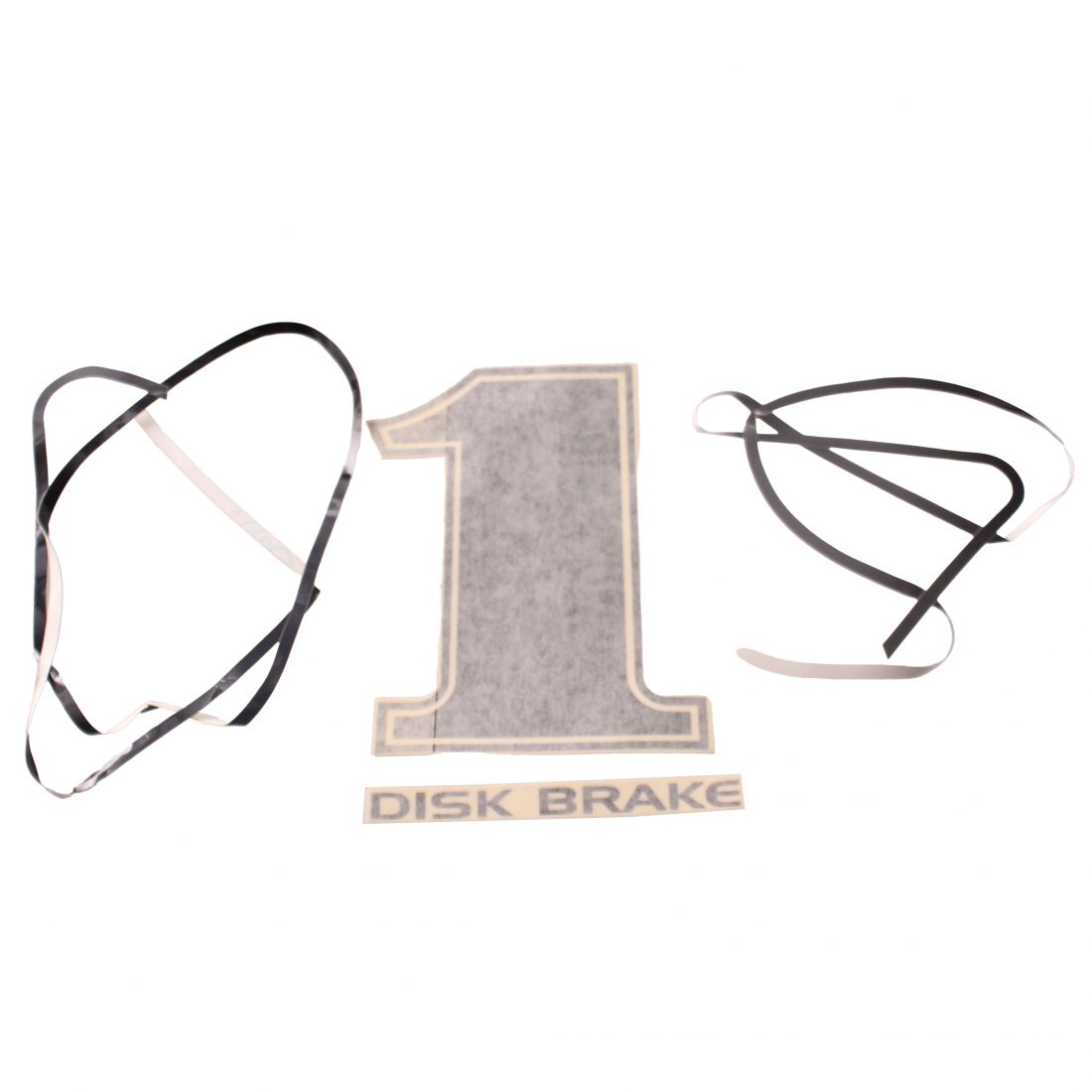 (R.23291) Vendo serie decalco parziale nuova originale Italjet con codice della serie completa 3381176 , la serie comprende un adesivo con il numero 1 di colore nero e bianco come da foto , un adesivo con scritta Disk Brake di colore nero e due strisce nere