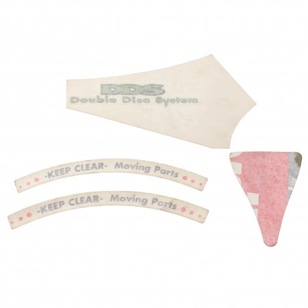 (R.12518) Vendo kit decalco sciolti nuovi per Aprilia SR 50 cc prima serie dal 1994 al 1996 originali Aprilia con codice del kit completo AP8237148 , scritta DDS double disc system verde - scritta KEEP CLEAR Moving Parts nera , disponibili solo gli adesivi in foto no serie completa