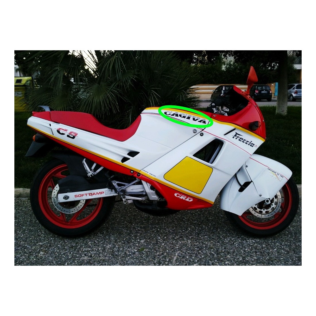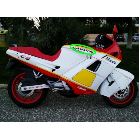 (R.14621) Vendo coppia decalchi superiori carene fianchetti sinistro e destro nuovi per Cagiva Freccia C9 125 cc di colore nero con lunghezza 325 mm e altezza 37 mm , il prezzo si intende per la singola coppia , per misure vedere foto , foto del veicolo solo a scopo dimostrativo