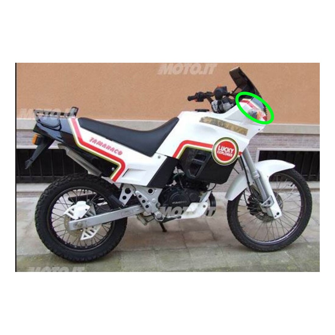(R.14680) Vendo decalco lato destro cupolino nuovo per Cagiva Tamanaco 125 cc Lucky Explorer di colore rosso - verde - bianco con lunghezza lato corto 105 mm e lato lungo 230 mm con altezza 45 mm , per misure vedere foto , foto del veicolo solo a scopo dimostrativo