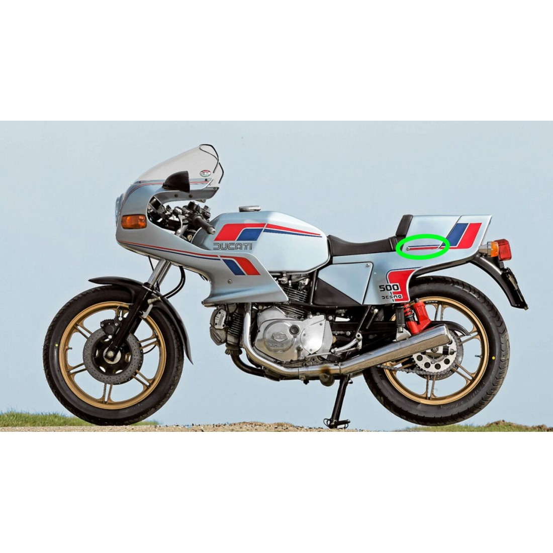 (R.14695) Vendo decalco fianchetto posteriore lato sinistro nuovo per Ducati Pantah 500 SL con codice 066085245 di colore rosso e blu con lunghezza 150 mm e altezza 19 mm , per misure vedere foto , foto del veicolo solo a scopo dimostrativo , disponibile solo lato sinistro no destro
