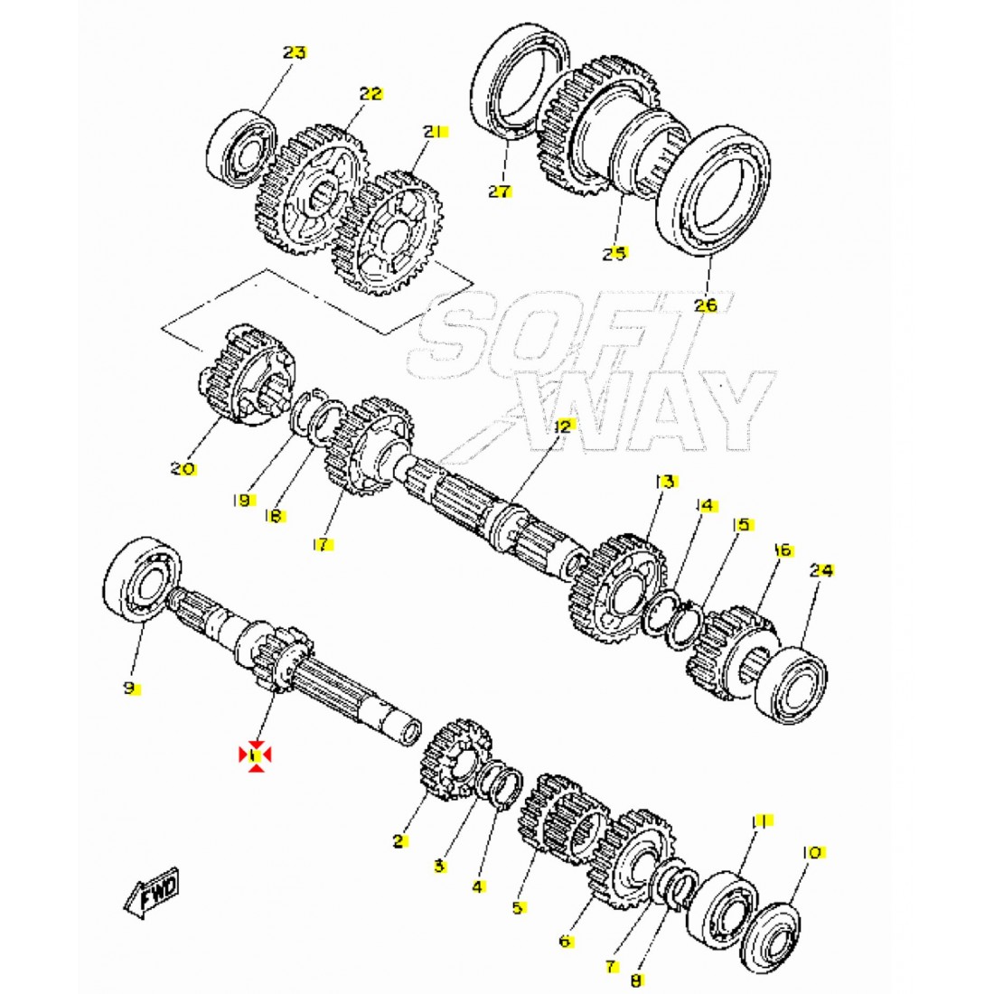 (R.21594) Vendo albero primario incompleto del cambio usato per Yamaha XV Virago 750 cc - XV SE Virago 1000 cc con codice Yamaha 4X7174110000 , per applicazioni e spaccato vedere foto