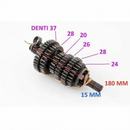 (R.730) Vendo alberino secondario cambio completo nuovo per Gilera 125 KK e KZ Endurance con codice Gilera 324007 e dentatura ingranaggi 37 , 28 , 20 , 26 , 28 , 24 denti , per misure vedere foto