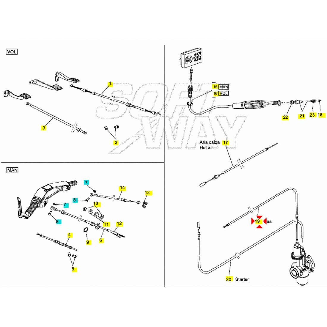 (R.23685) Vendo cavo trasmissione tra la pompa dell'olio e il carburatore per Piaggio Ape Car P2 P3 220 dal 1978 - Ape MP P501 P 601 220 dal 1978 - Ape TM P602 P 703 P 703V FL2 220 dal 1982 originale Piaggio con codice 224979 , per applicazioni e spaccato vedere foto