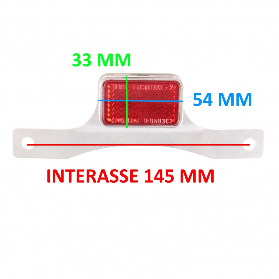 (R.17799) Vendo rinfrangente posteriore vintage nuovo per Piaggio Vespa e Innocenti Lambretta con interasse fori di fissaggio di 145 mm marchiato BENSI - PRISMALUCE - 2 APPR. I.G.M. N. 0603C2 con misura catadiottro 54 x 33 mm , per misure vedere foto