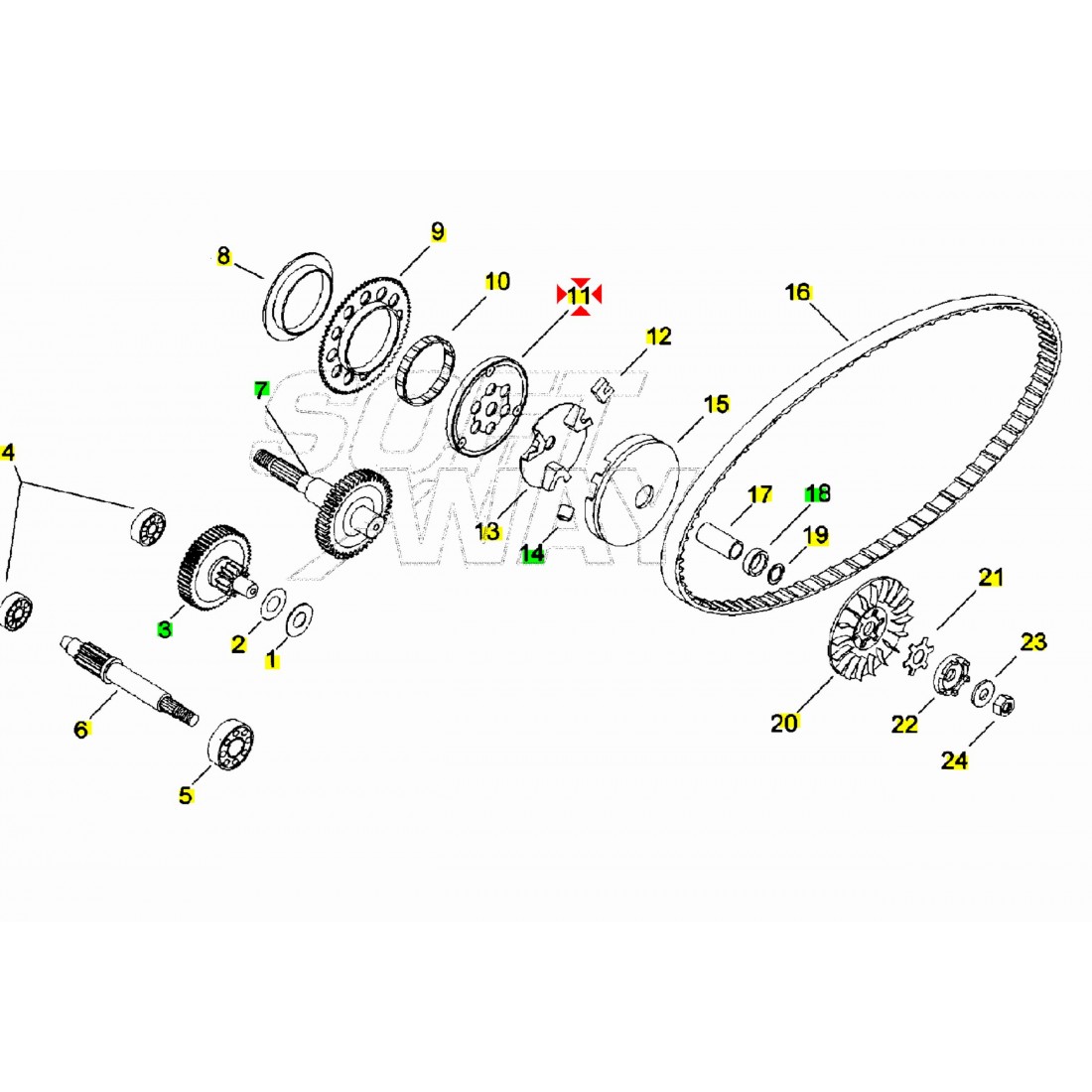 (R.21136) Vendo ruota libera nuova per scooter vari con motore Minarelli tipo Aprilia Amico - Area 51 - Gulliver - Rally - Scarabeo - Sonic - SR 50 cc con codice Aprilia AP8206147 - Benelli 491 - K2 - Naked - Pepe 50 cc con codice Benelli R16140181A0 - Malaguti Centro - Ciak - F10 - F12 Phantom - F15 Fire Fox - Yesterday 50 cc con codice Malaguti 74012500 - Yamaha BW'S - CS - CW - EW - Aerox - Why - Neo's 50 cc con codice Yamaha 3VL155700000 , per applicazioni e spaccato vedere foto