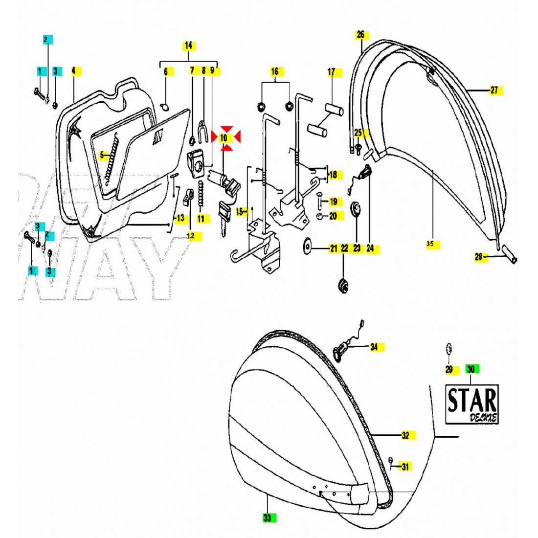 (R.16387) Vendo serie serrature bloccasterzo con tre cilindretti nuovo per LML Star Deluxe 125 - 150 cc dal 2001 completo di due chiavi con codice LML 179292 , per applicazioni ed esploso vedere foto