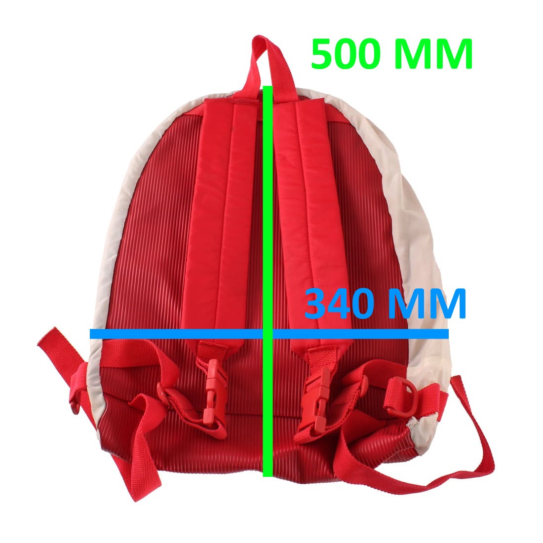 (R.19259) Vendo zaino vintage nuovo fondo di magazzino marca Flyplast di colore rosso e bianco con lunghezza 340 mm e altezza 500 mm con segni di magazzinaggio e con tessuto delle cinghie che si sgretola leggermente , per misure vedere foto