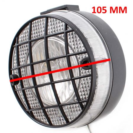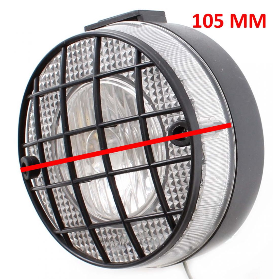 (R.7506) Vendo fanale anteriore nuovo per biciclette cross vintage con alimentazione a dinamo completo di mascherina di protezione in plastica di colore nero marca Phos con codice 681.00 o 68100 , diametro 105 mm