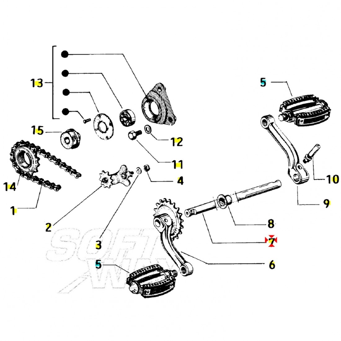(R.1471) Vendo albero porta pedivella usato per Piaggio Ciao prima serie - Tre - L - SC 50 cc dal 1971 con telai CT31T e codice Piaggio 103694 , per misure con applicazioni ed esploso vedere foto
