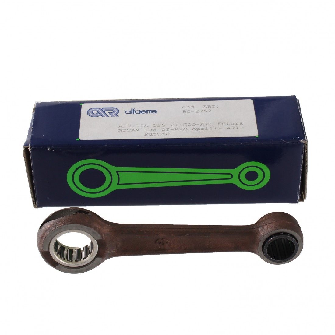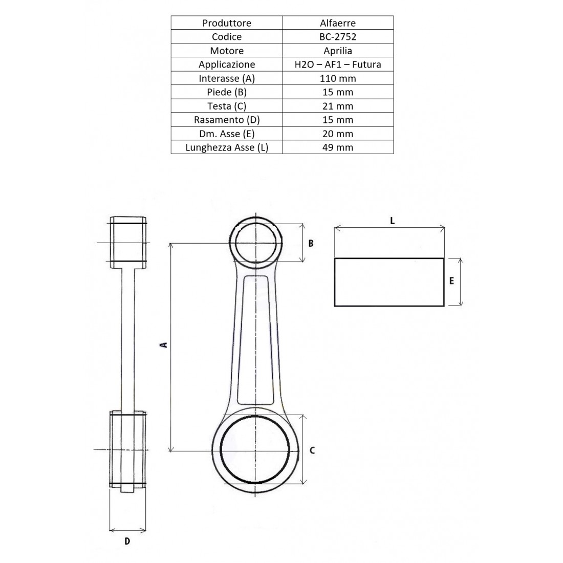 (R.16361) Vendo biella completa nuova per Aprilia H2O - AF1 - Futura 125 cc a due tempi con interasse da 110 mm , diametro asse di accoppiamento da 20 mm e lunghezza asse di 49 mm con codice Alfa Erre BC-2752 , per misure vedere foto