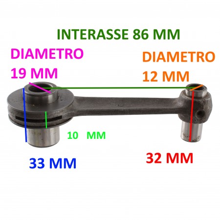 (R.11517) Vendo biella per albero motore nuova per Benelli Turismo 48 cc con codice simile a Mazzuchelli BCO0216 , con interasse 86 mm spinotto 12 x 32 e spinotto piede biella 19 x 33 , marca CFM completa con asse accoppiamento , rondelle rasamento , rulli e spinotto marchiata CFM BE 48 cc S , per misure vedere foto