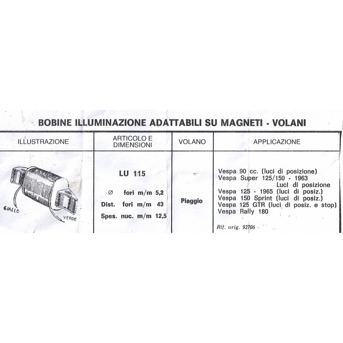 (R.19684) Vendo bobina illuminazione nuova per Piaggio Vespa 90 cc - Super 125 e 150 cc dal 1963 - Vespa 125 cc dal 1965 - Sprint 150 cc - GTR 125 cc - Rally 180 cc marca Ceab con codice LU 115 simile a codice Piaggio 92706 con interasse fori 43 mm e spessore nucleo 12,5 mm , per misure e applicazioni vedere foto