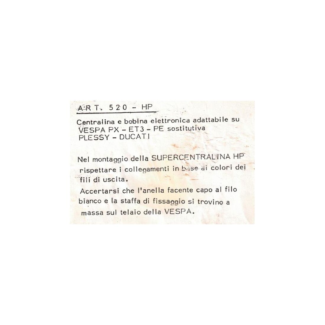 (R.22029) Vendo centralina con bobina elettronica sostitutiva Plessey e Ducati per Piaggio Vespa ET3 - PX - PE marca HP Line , nel montaggio della SUPERCENTRALINA HP rispettare i collegamenti in base ai colori dei fili di uscita , accertarsi che l'anella facente capo al filo bianco e la staffa di fissaggio si trovino a massa sul telaio della Vespa , per istruzioni di montaggio vedere foto