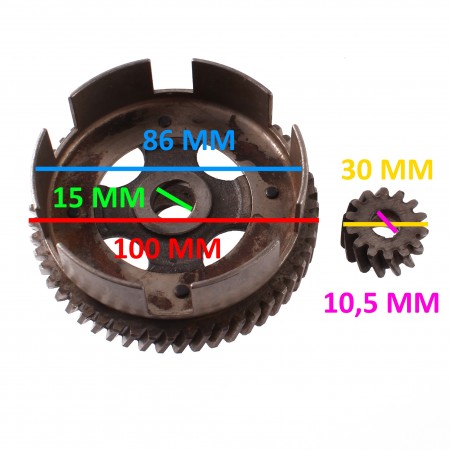 (R.18500) Vendo campana frizione a 6 tacche nuova probabilmente per motori Minarelli con corona da 52 denti e pignone da 14 denti con diametro esterno corona 100 mm e diametro interno campana 86 mm con diametro esterno pignone 30 mm , il prezzo si intende per l'intero kit , per misure vedere foto , controllare compatibilità prima dell'acquisto
