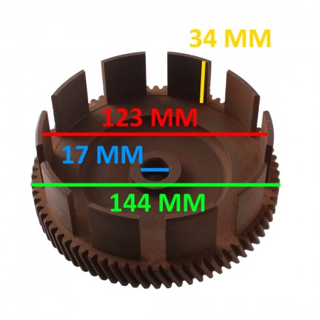 (R.20939) Vendo campana frizione nuova a 10 tacche e con 74 denti per moto vintage di cui non conosciamo il modello con diametro interno 123 mm e diametro ingranaggio 144 mm con altezza tacche 34 mm e foro centrale da 17 mm , per misure vedere foto , controllare compatibilità prima dell'acquisto