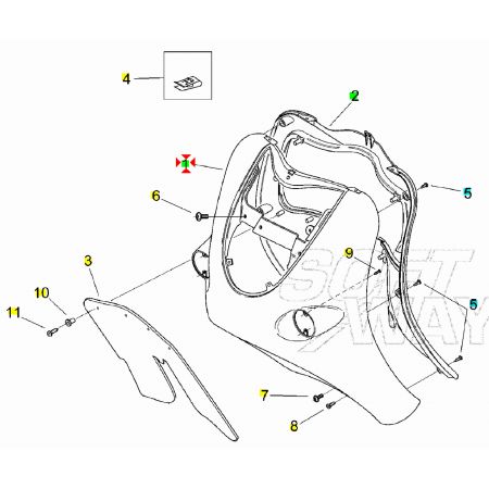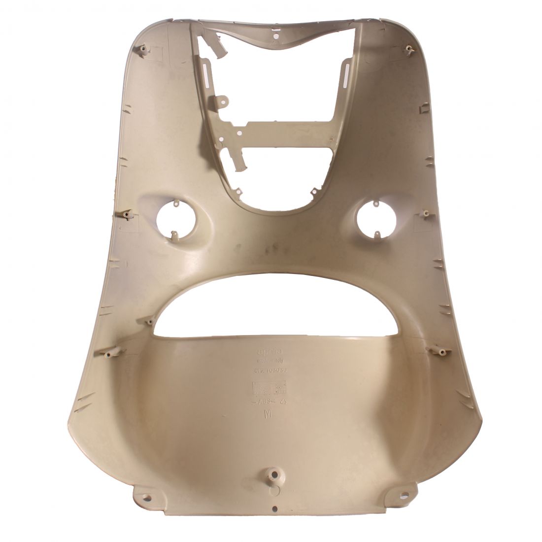(R.22999) Vendo carena scudo anteriore nuova con attacchi danneggiati come segnalato in foto originale Aprilia con codice AP8158469 per Aprilia Mojito Retro 50 dal 1999 di colore grigio sabbia , per applicazioni e spaccato vedere foto