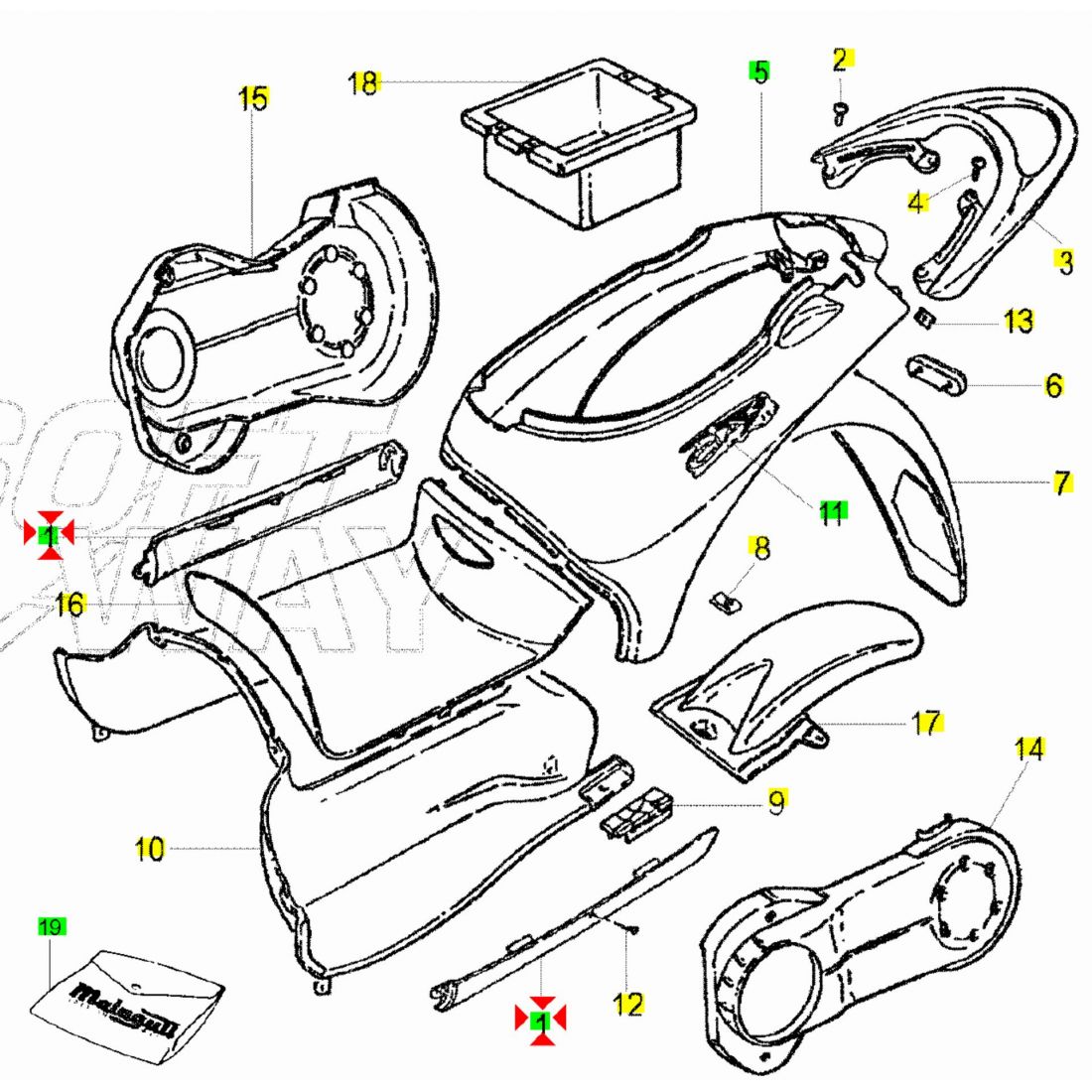 (R.23255) Vendo serie di profili della pedana  nuova originale Malaguti con codice 06320494 per Malaguti Ciak Elettrico dal 2000 di colore blu notte , per applicazioni e spaccato vedere foto