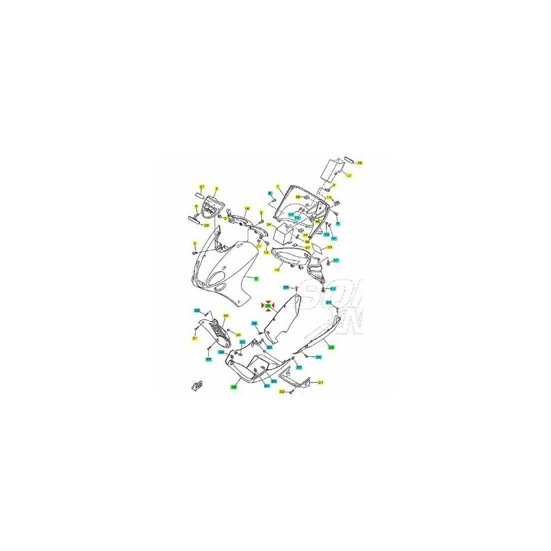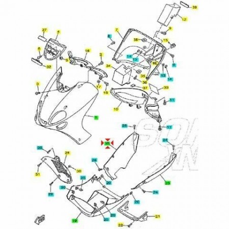 (R.9906) Vendo fianchetto inferiore laterale destro usato per Yamaha Majesty 125 cc o MBK Skyliner dal 1998 di colore cristallo CST con codice 5DSF171M03P6 , per applicazioni ed esploso vedere foto