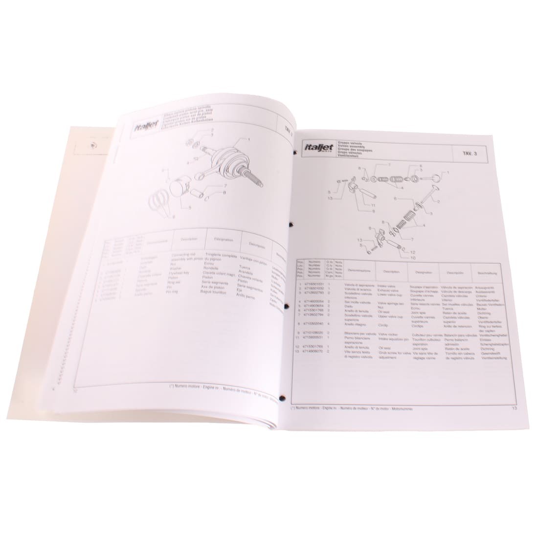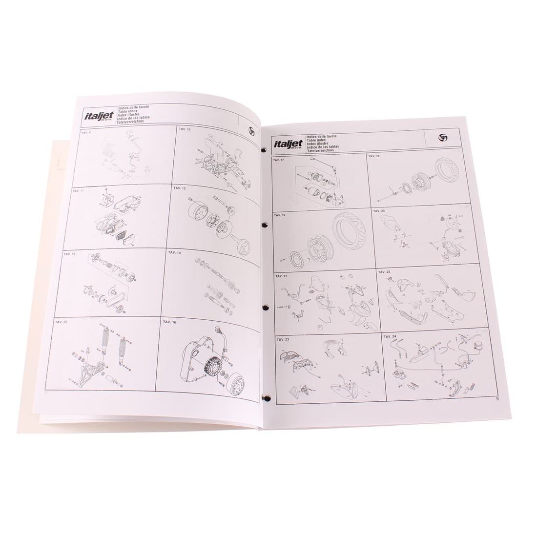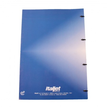 (R.19336) Vendo prontuario parti di ricambio con esplosi nuovo fondo di magazzino per Italjet Jupiter 250 cc in italiano - inglese - francese - spagnolo - tedesco con leggeri segni di magazzinaggio e con copertina danneggiata che si stacca come da foto