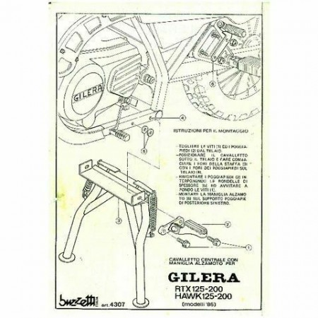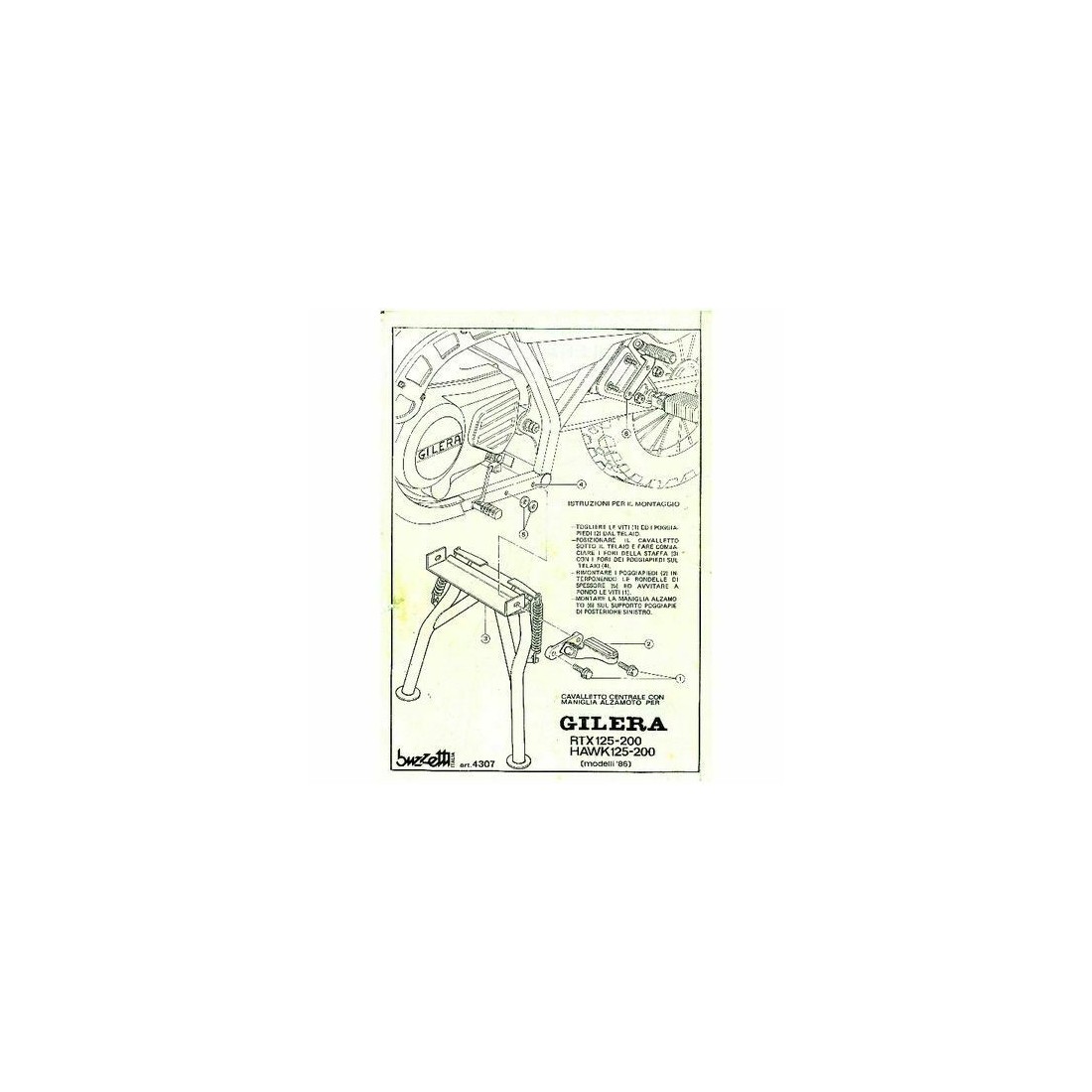 (R.236) Vendo cavalletto centrale nuovo per Gilera RTX 125 e 200 cc. e Hawk 125 e 200 cc. dal 1986 completo di foglio istruzioni montaggio con viti e staffa , marca Buzzetti con codice 4307