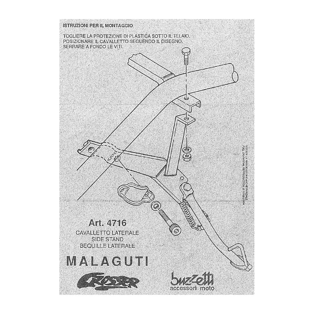 (R.15293) Vendo zampa di sostegno laterale nuova per Malaguti Crosser 50 cc marca Buzzetti con codice 4716 di colore nero con scritta bianca , per istruzioni di montaggio vedere foto