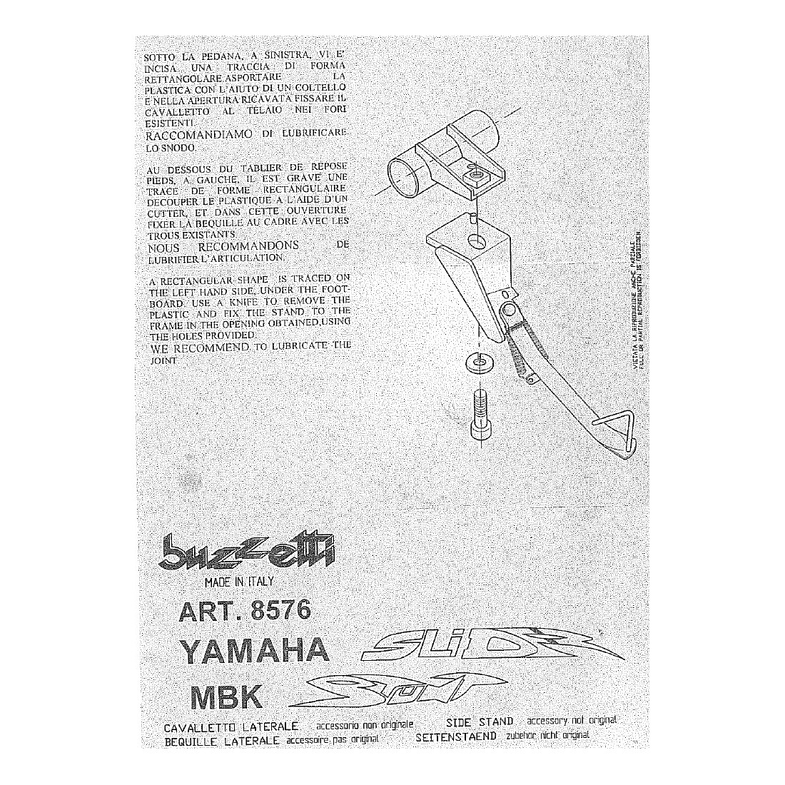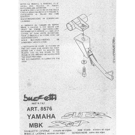 (R.16094) Vendo cavalletto laterale nuovo per MBK Stunt - Yamaha Slider marchiato Buzzetti di colore nero con scritta bianca con codice 8576 , per istruzioni di montaggio vedere foto