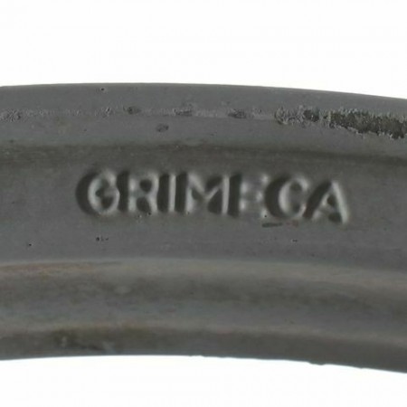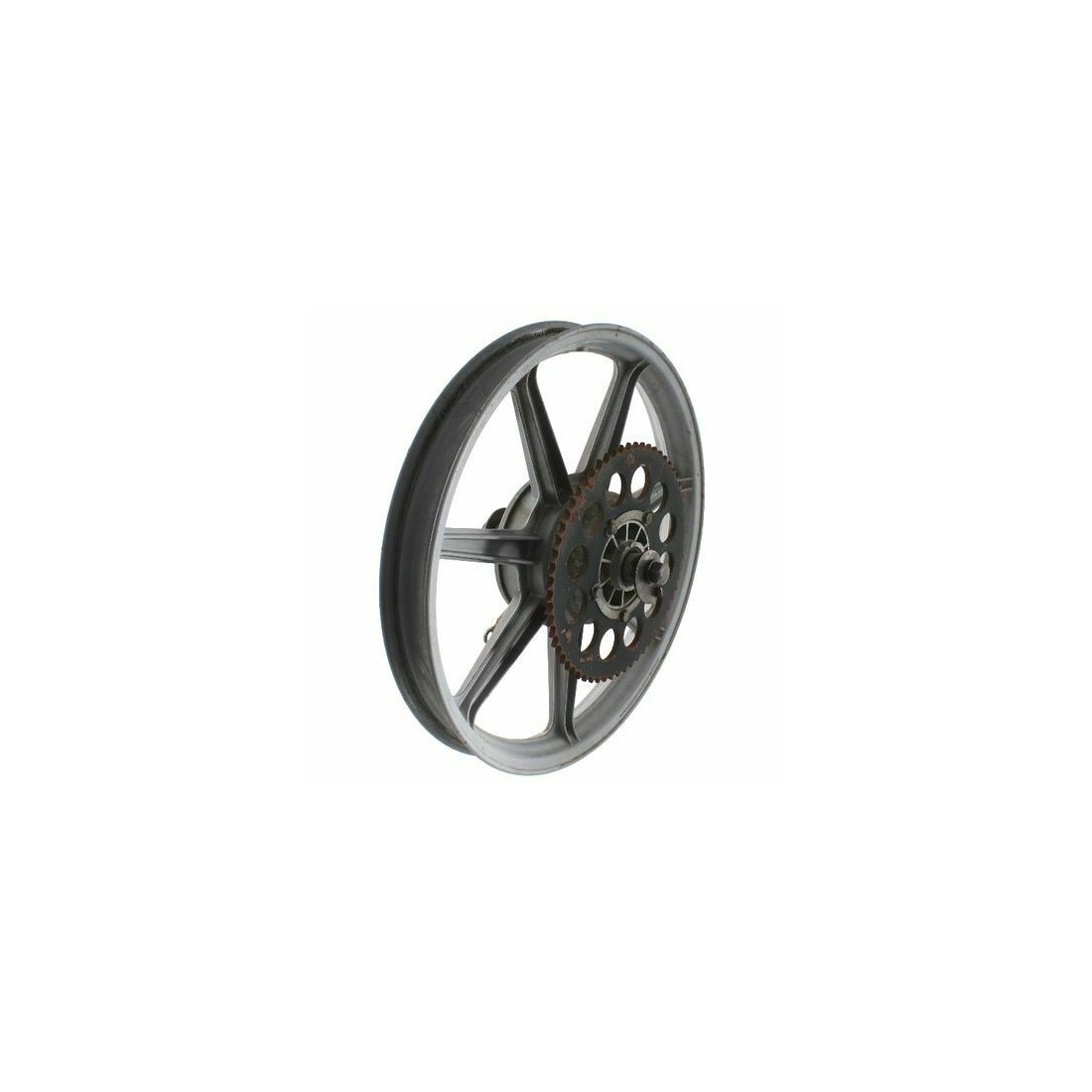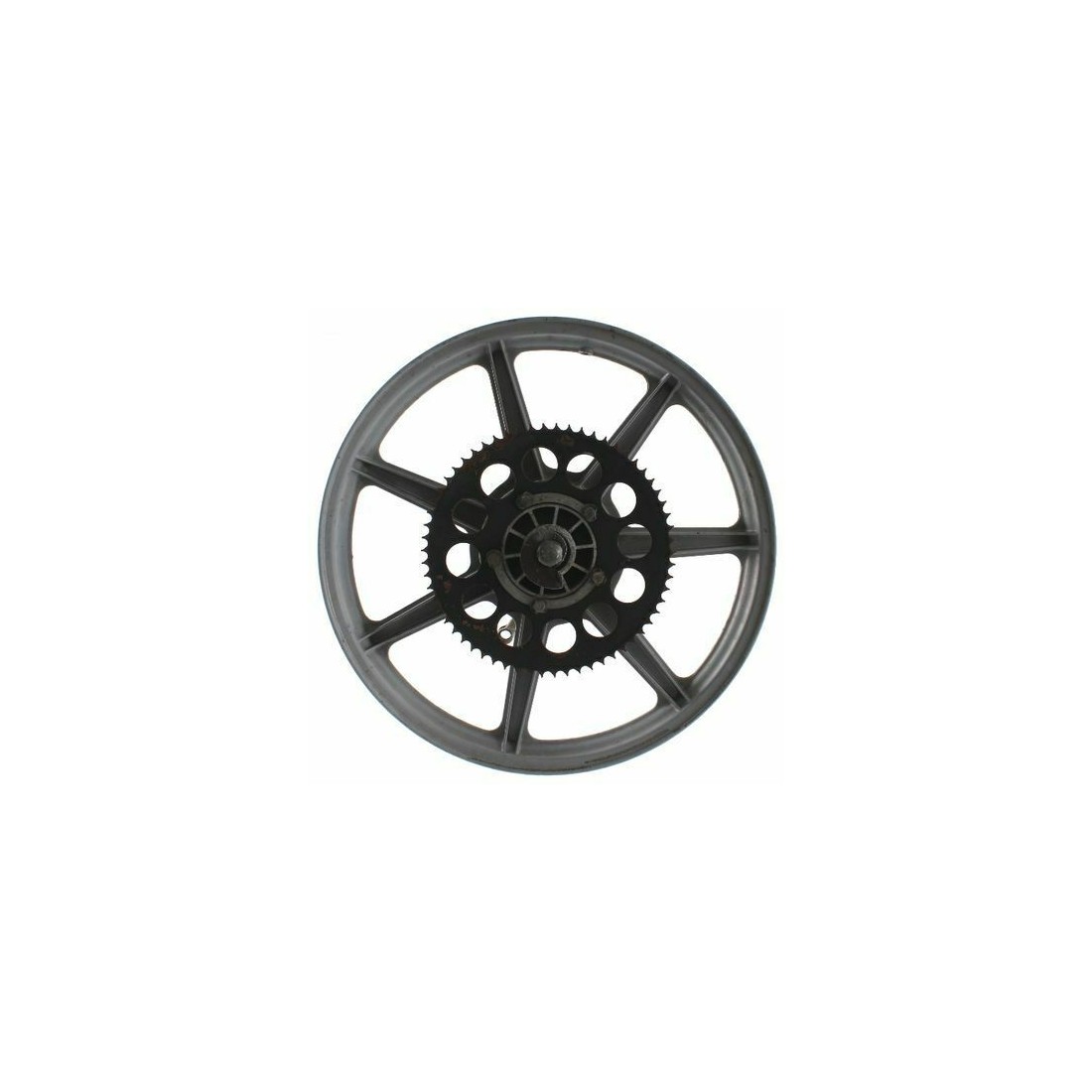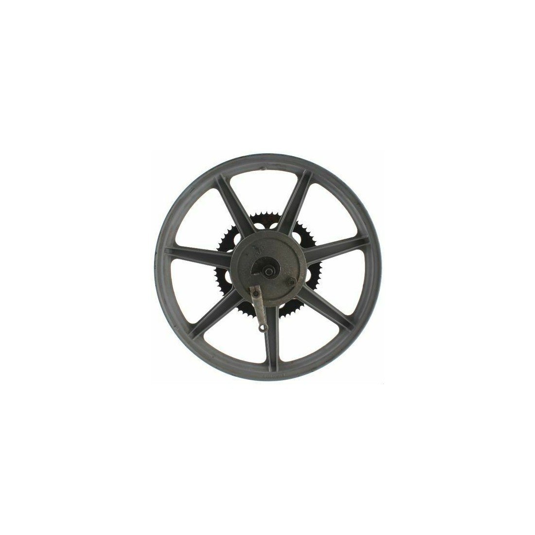 (R.11692) Vendo cerchione ruota posteriore usato per Cagiva SST 125 cc a 7 razze marca Grimeca di colore grigio chiaro marchiato E 1.85 X 18 DOT - D completo di mozzo ruota e corona con 62 denti