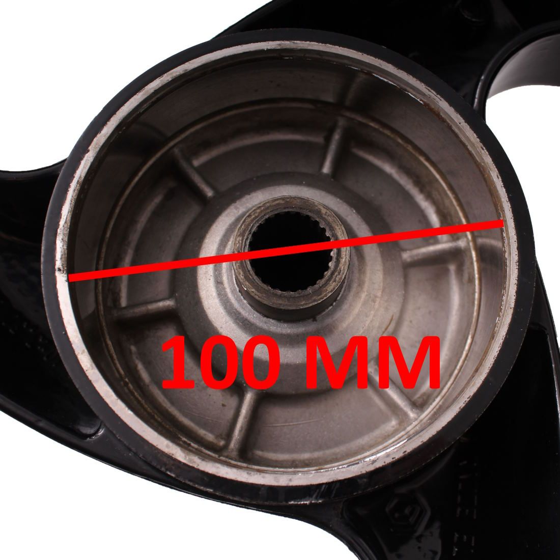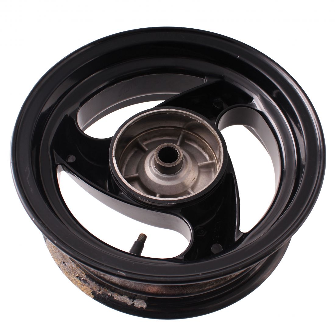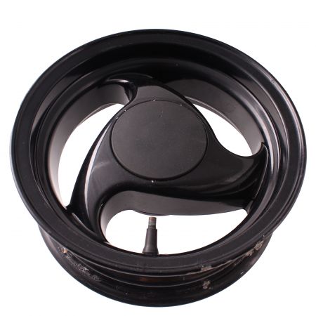 (R.24487) Vendo cerchio ruota posteriore usato per Gilera Typhoon 50 TEC1T dal 1993 al 1997 marca Grimeca a 3 razze elicoidali da 10 pollici con diametro interno mozzo 100 mm , per misure vedere foto