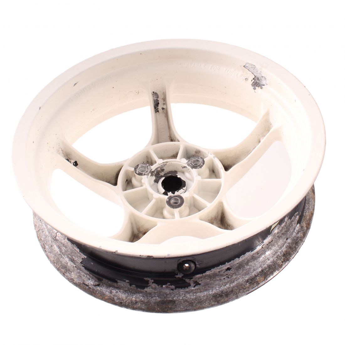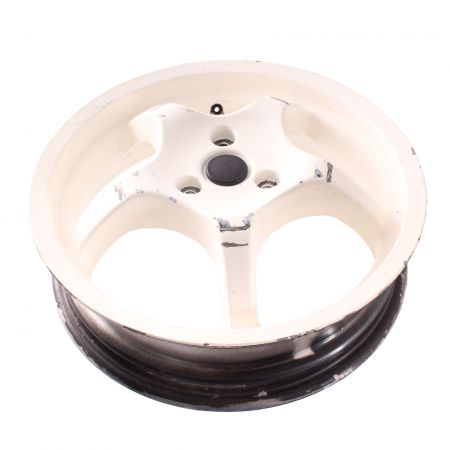 (R.24492) Vendo cerchio ruota posteriore usato per Yamaha Aerox marca Grimeca a 5 razze misura 13 x MT 3.50 marchiato J 13 x MT3.50 DOT da 13 pollici di colore bianco