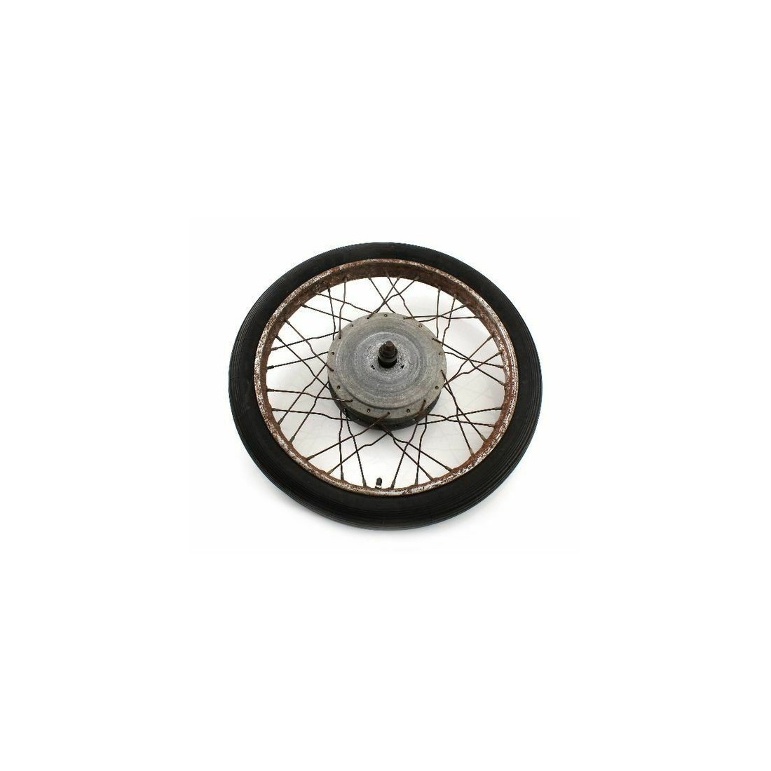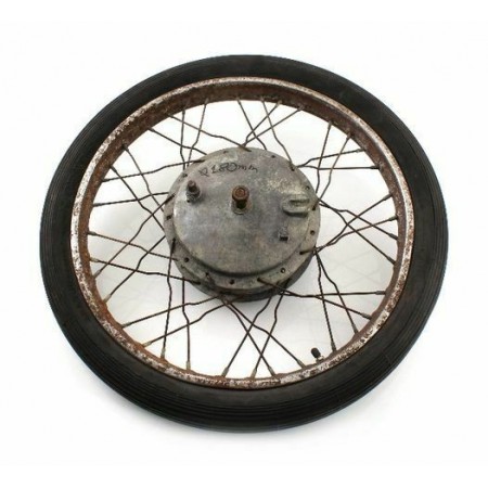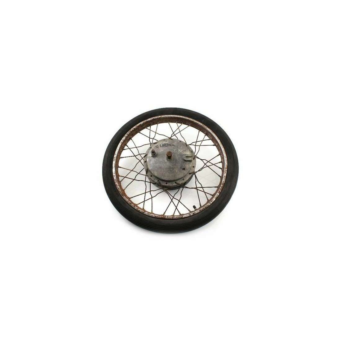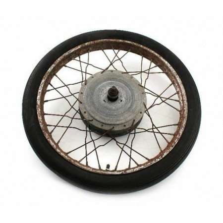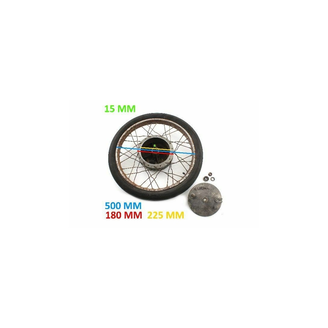 (R.5307) Vendo cerchio usato completo di copertone 2.50 x 19 per moto generiche epoca anni 70 e 80 con diametro interno mozzo 180 mm e diametro perno 15 mm , diametro cerchio 50 cm, per misure vedere foto
