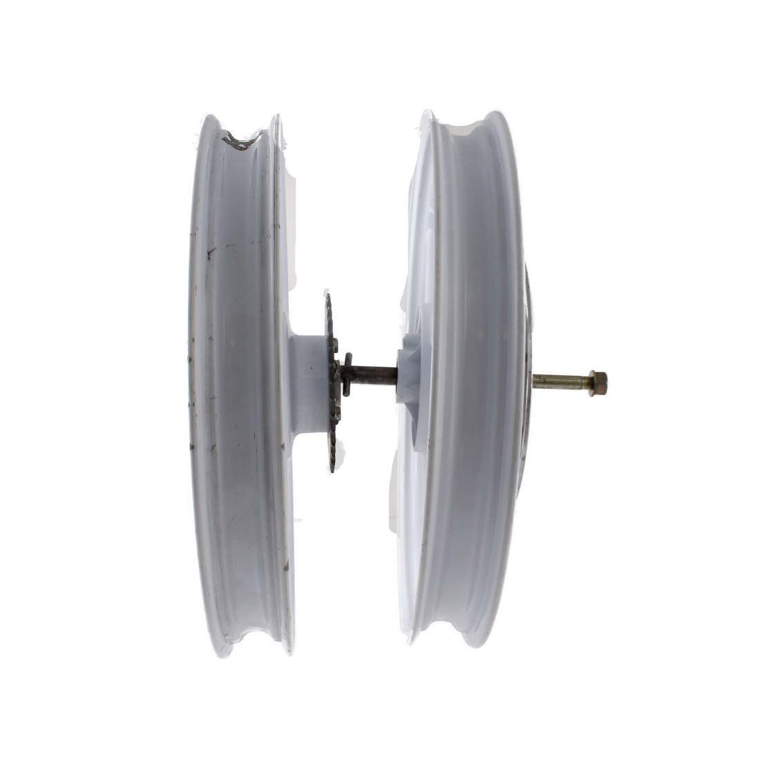 (R.12449) Vendo coppia cerchioni in lega anteriore e posteriore usati senza piatto portaceppi da 1.60 x 16 pollici per ciclomotori Motron anni 80 90 tipo Motron GTO marchiati Grimeca , E - 1.60 x 16 DOT - D a 3 RAZZE AVIO di colore bianco