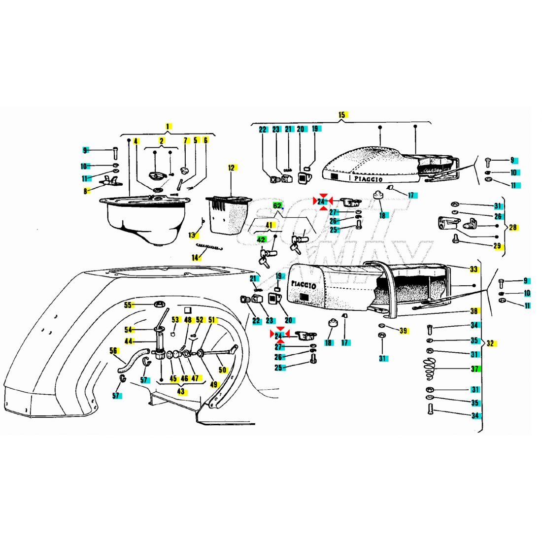 (R.23190) Vendo scatola della serratura della sella nuova originale Piaggio con codice 215438 per Piaggio Vespa PK 50 , 80 , 100 e 125 dal 1982 - Vespa PK 50 , 80 e 125 con avviamento elettrico dal 1984 , per applicazioni e spaccato vedere foto