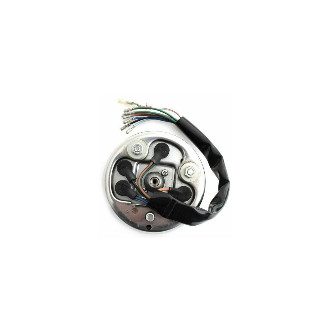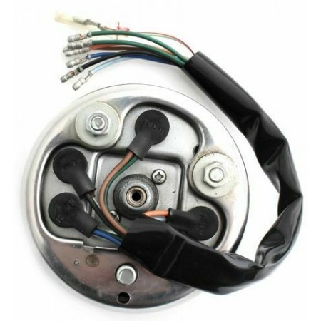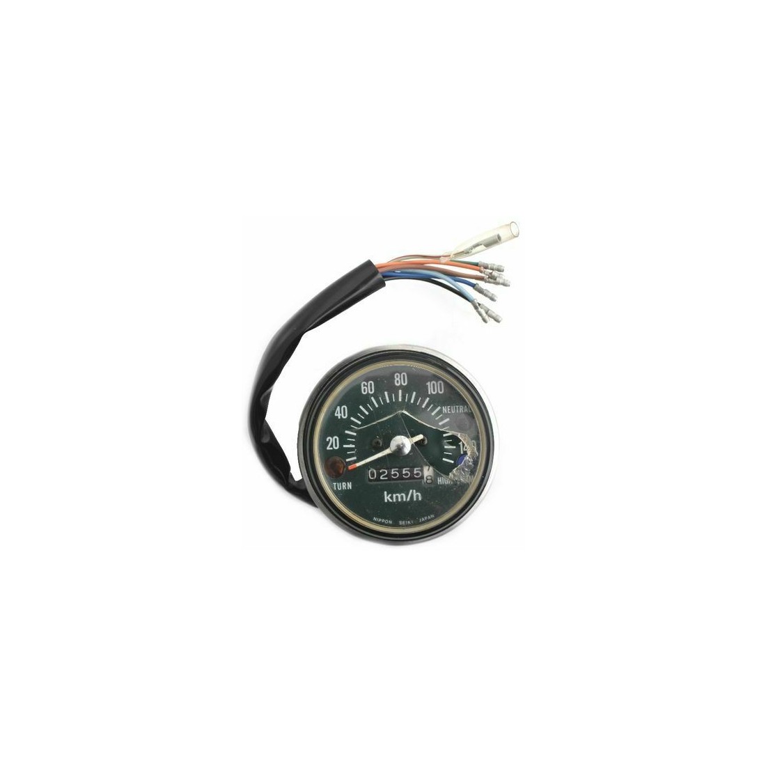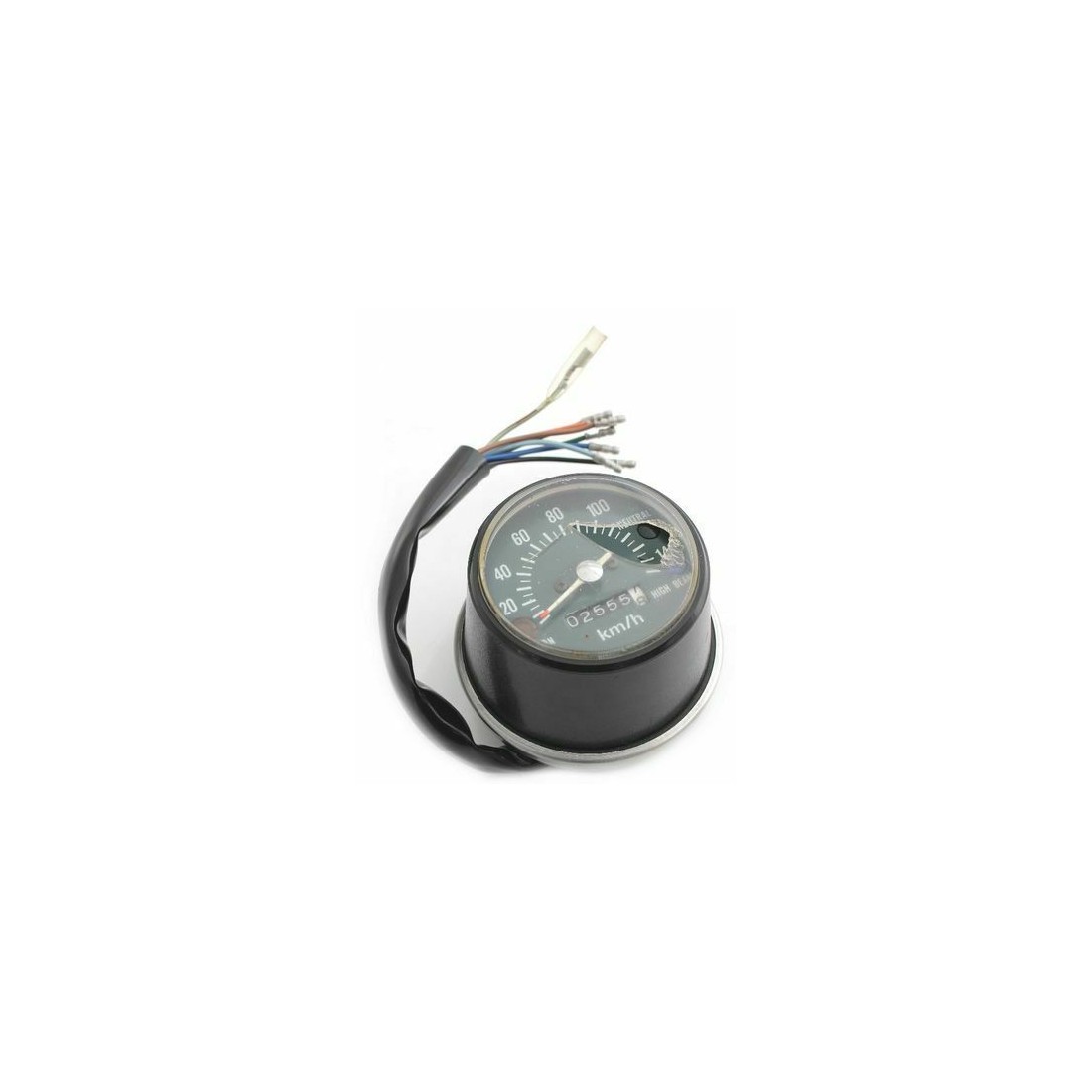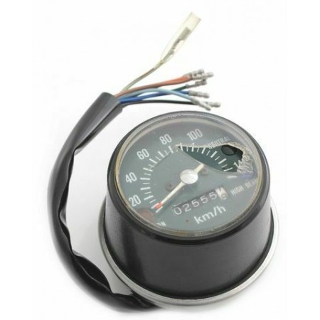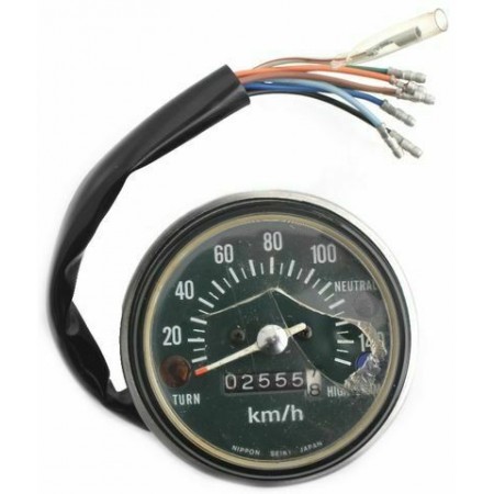 (R.9201) Vendo contachilometri usato con vetro strumento rotto da sostituire per Honda CB 125S , probabilmente anche per Honda CB 125 J e 125J con codice Honda 37200383611 o 37200-383-611 scala da 0 a 140 km/h con quadrante di colore verde scuro , attacco cablaggio otto fili di colore verde e rosso , marrone , azzurro , nero , arancione , blu e due verdi scuro