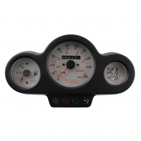 (R.989) Vendo gruppo strumenti cruscotto nuovo scala da 0 a 100 Km/h per Peugeot Speedfight aria e X-fight con codice Peugeot 735412 o 747966 con cornice nera e sfondo bianco con lancetta rossa e scritte nere con piccola crepa su plastica inferiore come da foto