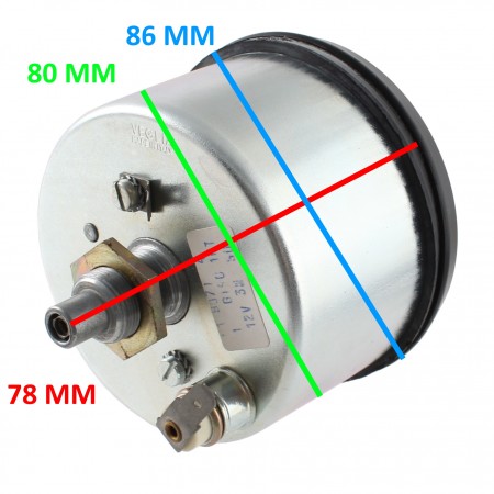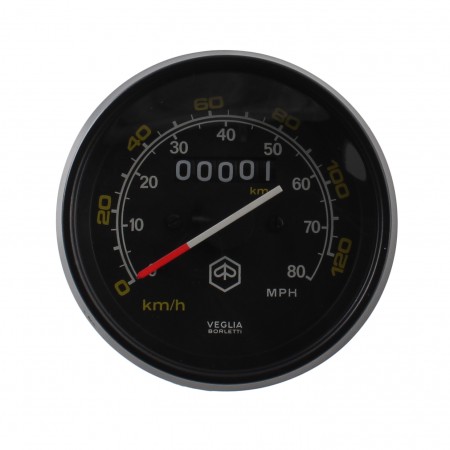 (R.15146) Vendo contakilometri doppia scala da 0 a 120 Km/h e da 0 a 80 mph nuovo originale Piaggio epoca fondo di magazzino per Vespa PX prima serie America con codice Piaggio 190523 marchiato Veglia e con logo Piaggio esagonale con sfondo nero e cifre bianche e gialle tipo America con lancetta bianca e rossa e cornice nera con diametro 80 mm e diametro cornice 86 mm con lunghezza 78 mm , per misure vedere foto