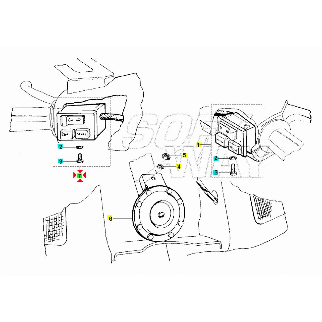 (R.23439) Vendo commutatore frecce sinistro con clacson nuovo per Piaggio Cosa 1 CL CLX avviamento con pedalina dal 1988 con attacchi a 6 pin e a 3 pin originale Piaggio con codice 254959 , per applicazioni e spaccato vedere foto