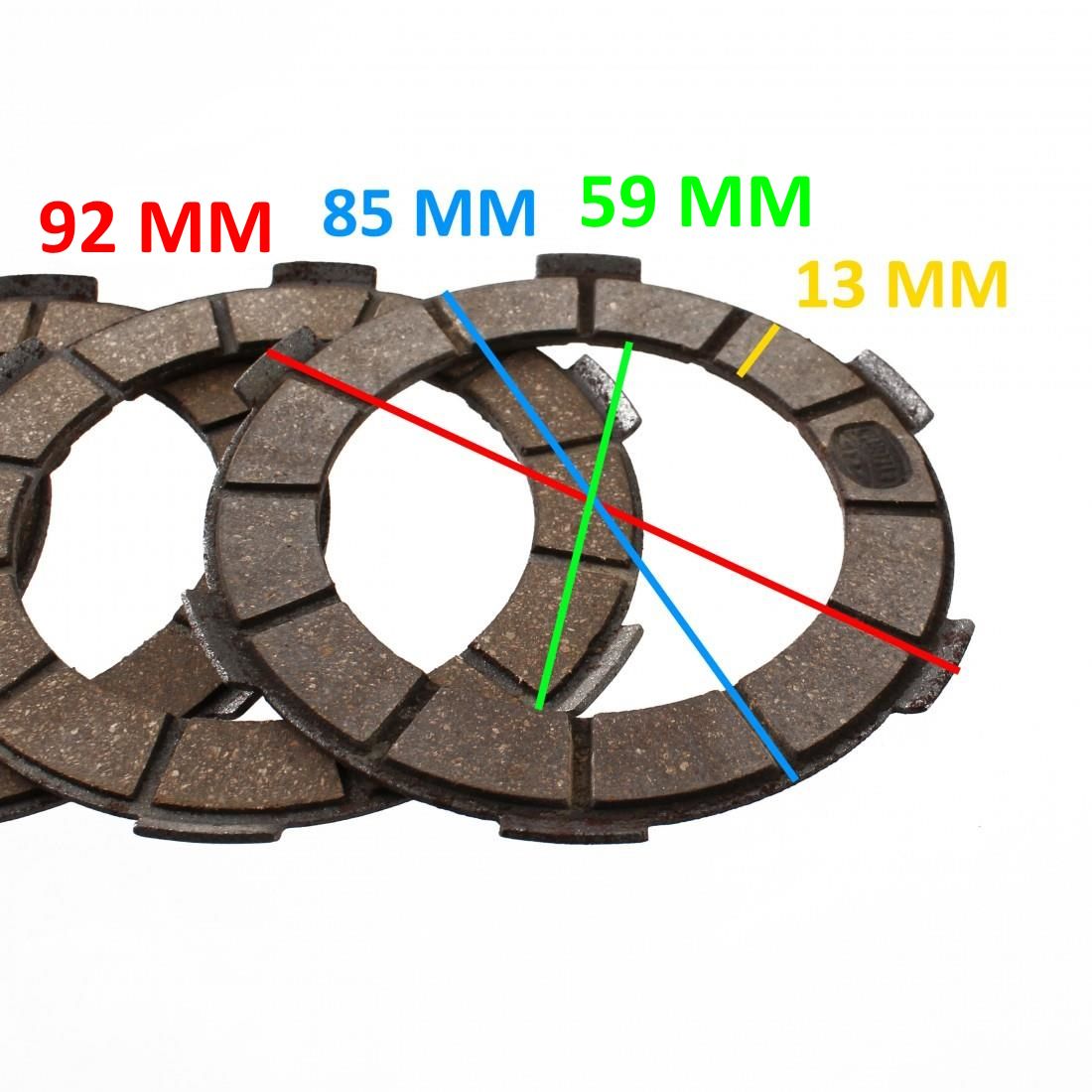 (R.24231) Vendo serie di dischi frizione nuova per motori Minarelli P4 marca Surflex con codice S1047/D composta da 4 dischi , con diametro interno 59 mm , diametro esterno 85 mm , diametro esterno tacche 92 mm e larghezza disco 13 mm , per misure vedere foto , il prezzo si intende per l'intera serie