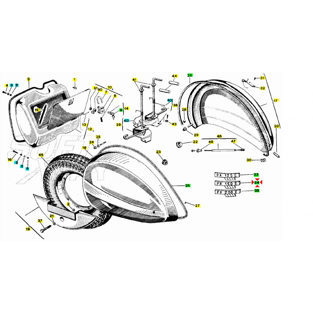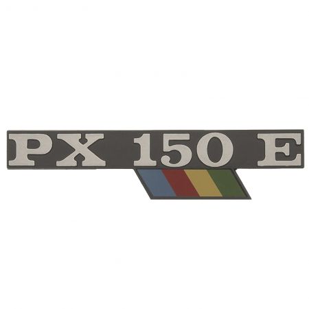 (R.22211) Vendo emblema in alluminio del cofano laterale con scritta "PX 150 E" per Piaggio Vespa PXE Arcobaleno 150 cc dal 1981 simile a codice Piaggio 226819 , per applicazioni e spaccato vedere foto