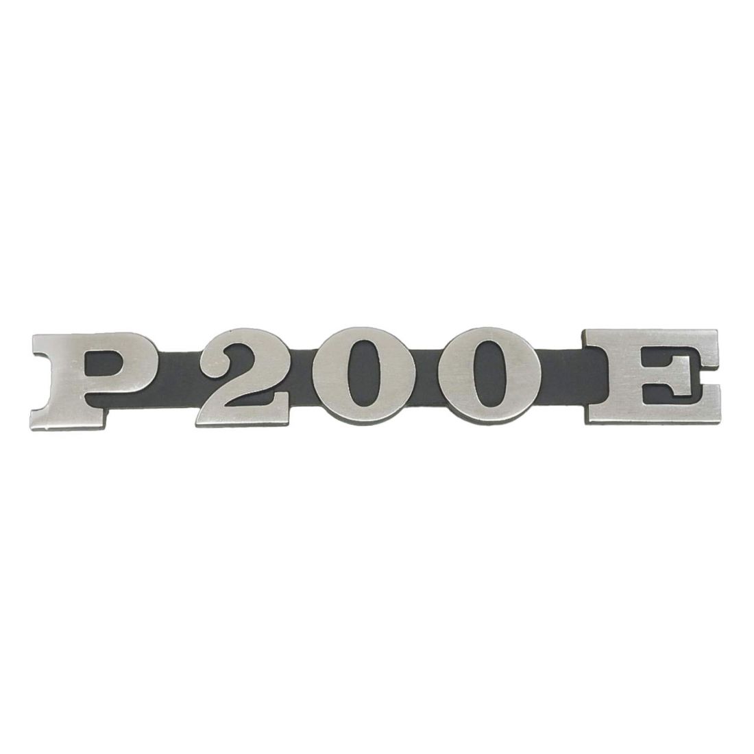 (R.22217) Vendo targhetta nuova in alluminio del cofano laterale con scritta " P 200 E " per Piaggio Vespa PE 200 cc dal 1978 simile a codice Piaggio 195641 , per applicazioni e spaccato vedere foto