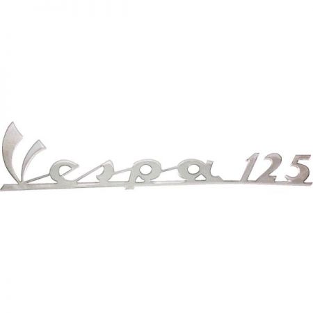 (R.23546) Vendo emblema scudo anteriore nuovo per Piaggio Vespa Primavera 125 con scritta Vespa 125 argentata con tre pioli da 3 mm. per il fissaggio con interasse 74 e 51 simile a codice Piaggio 073488 , per applicazioni e spaccato vedere foto